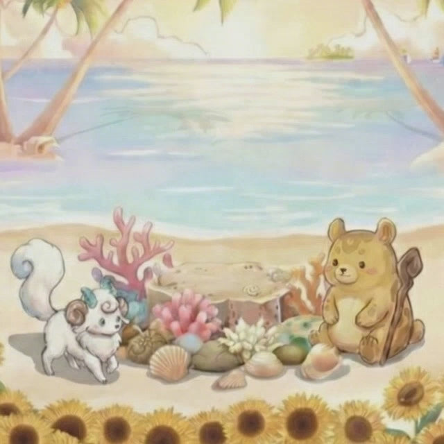 The illustration features a peaceful tropical beach with soft pastel skies, swaying palm trees, warm sunlight, and friendly characters gathered around a sandy shore. Sunflowers, seashells, and coral details add a playful yet soothing atmosphere, evoking a slow, relaxing summer day.