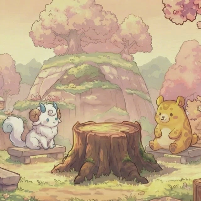 The illustration depicts a cozy spring forest filled with soft blossoms, warm light, and friendly characters gathered around a peaceful tree stump. Its calm color palette and storybook-style details create a relaxing atmosphere, making it ideal for mindful puzzle time as well as creative display.