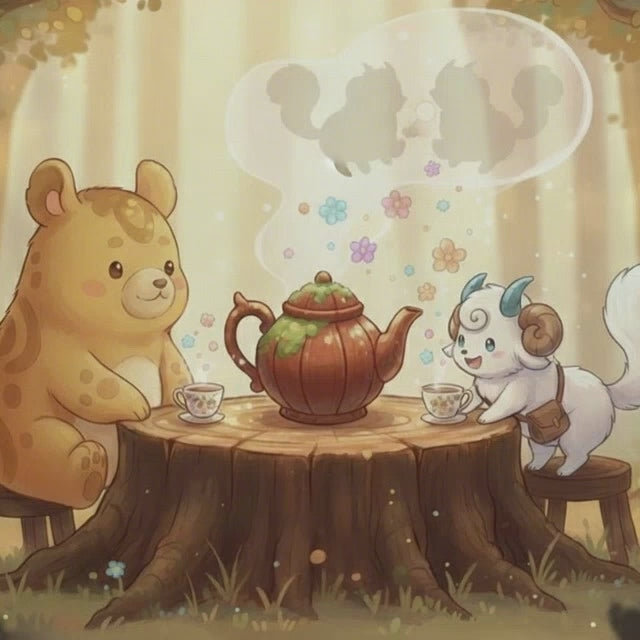 Soft 100% cotton threads are woven into a tapestry-like scene of two forest friends sharing tea at a small stump table, surrounded by dappled woodland light.